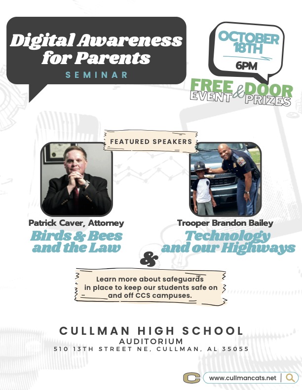 CULLMAN, Ala. – Cullman City Schools will host a Digital Awareness Seminar for city school district parents, students and community members on Tuesday, Oct. 18. The free event will be held at the Cullman High School auditorium from 6-7:30 p.m.