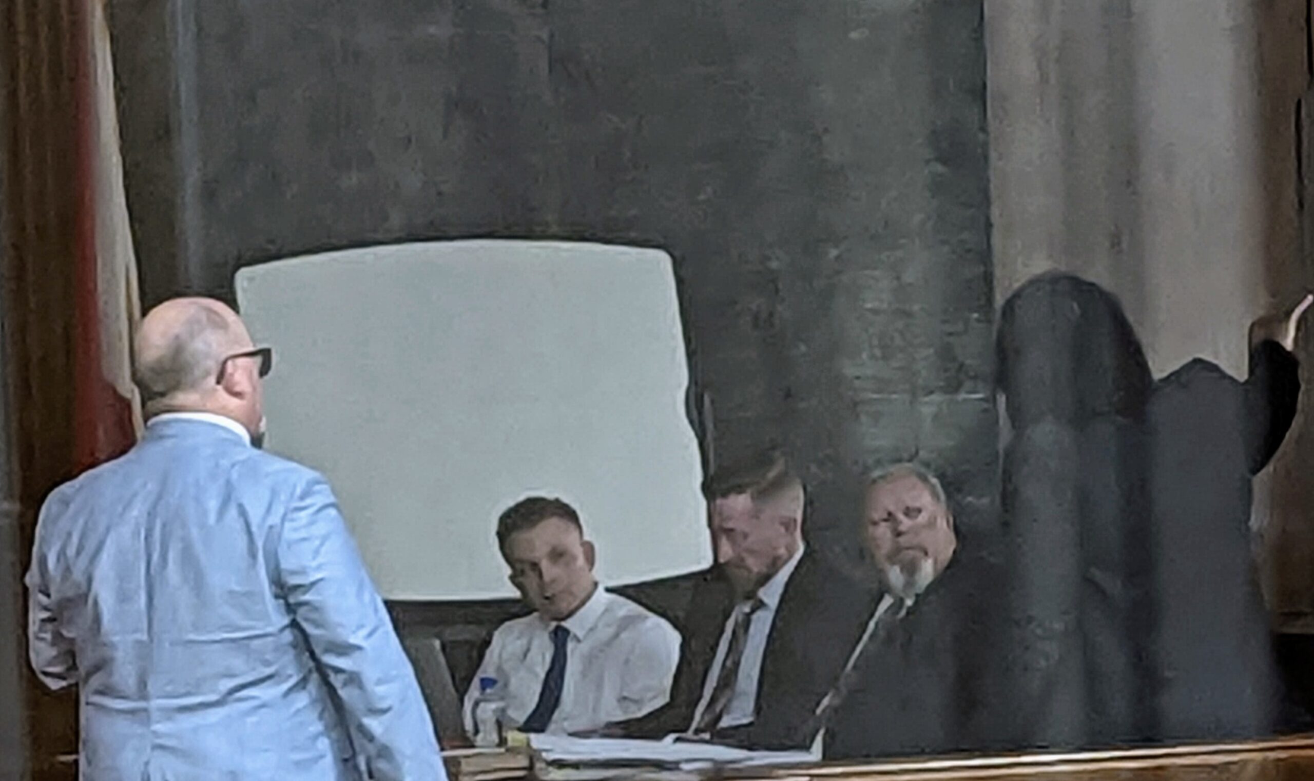 The prosecution rested its case midday, and the jury was instructed to return at 12:50 p.m. for the trial to resume at 1 p.m. However, at 1 p.m., the public was not allowed into the courtroom where the prosecution, the defense, the defendant and judge were in discussion. The public was told there was a delay while waiting for a witness. At 1:55 p.m. the trial resumed with the first witness for the defense providing a video deposition.