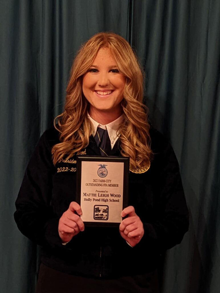 Holly Pond High School’s Mattie Leigh Wood was named the 2022 Farm-City Outstanding FFA Member. The Holly Pond senior won Grand Champion Market Goat, placed third in Senior Showmanship and third in Supreme Competitor at the Alabama National Fair in Montgomery recently.