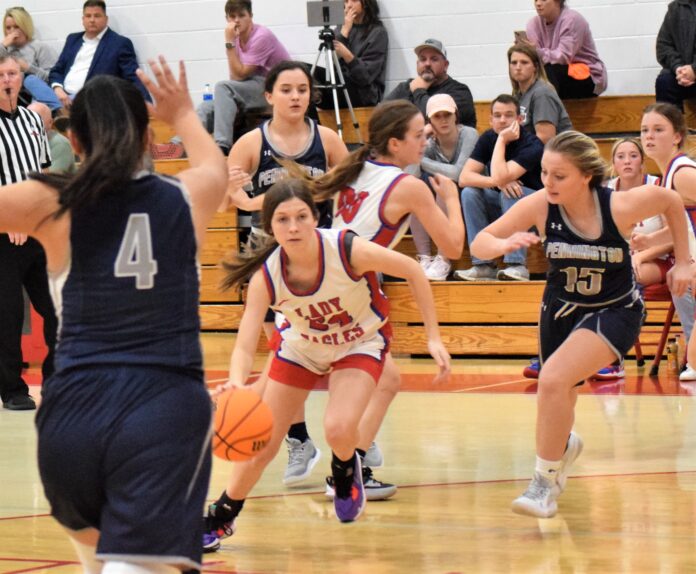 Neither team scored for the first two-plus minutes of the game before Morgan Flanagan drilled a three from the right corner to put Vinemont on the scoreboard first. A layup by Caroline Miller made it 5-0, but J.B. Pennington got on the scoreboard on a short jumper. Vayda Yarbrough knocked down a trey to push the Lady Eagle lead to 8-2 and later on, hit another one from long-range as Vinemont took an 11-4 lead into the second period.
