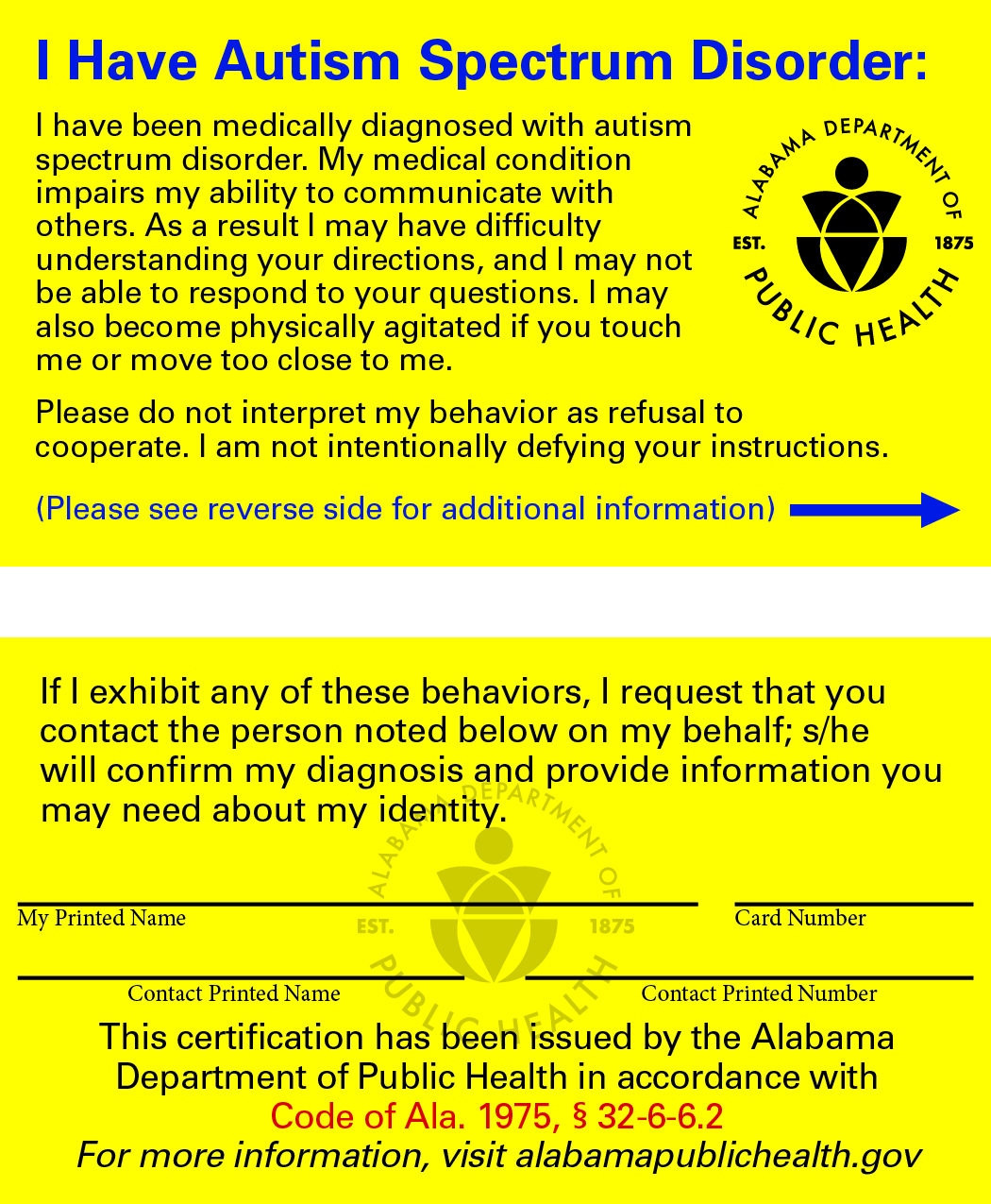 Before a card is issued, a health care provider (such as a psychologist, pediatrician or family practice doctor) must verify that the person is on the autism spectrum. The cards also contain the contact information for someone who can confirm the cardholder’s diagnosis and give information that may help calm the individual. The Autism Spectrum Disorder Card Registration Form (www.alabamapublichealth.gov/disability/assets/autismspecdiscardregform.pdf) may be downloaded, printed and brought to any county health department.