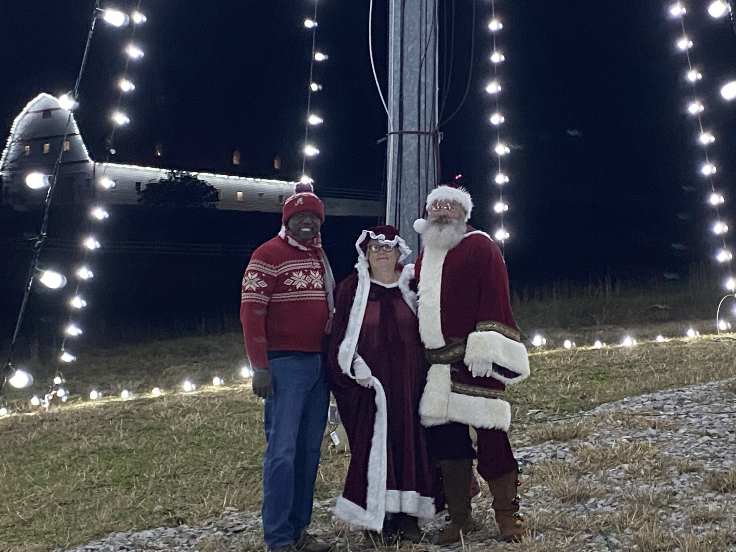 Warrior City Councilman John Tanks, left, poses for a photo with Mrs. Claus and Santa (Terrie and Raymond Tyler) under the Hallmark Farms Christmas tree Thursday, Dec. 1, 2022. (Sara Gladney for the Cullman Tribune)