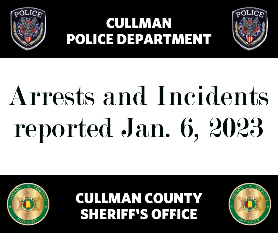 CULLMAN, Ala. – Below are the arrests and incidents reported Jan. 6, 2023. All persons are innocent until proven guilty.