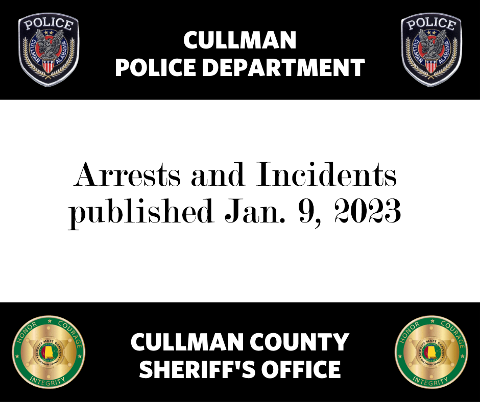 CULLMAN, Ala. – Below are the arrests and incidents reported Jan. 9, 2023. All persons are innocent until proven guilty.