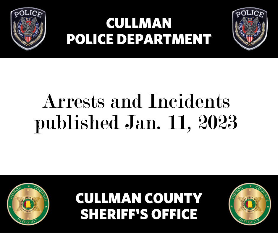 CULLMAN, Ala. – Below are the arrests and incidents reported Jan. 11, 2023. All persons are innocent until proven guilty.