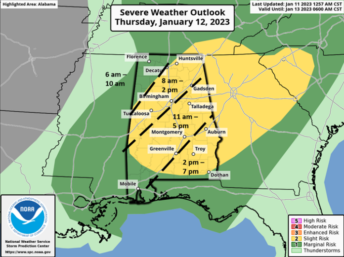 CLANTON, Ala. – Thunderstorms will develop ahead of a cold front moving quickly through the state on Thursday. During the morning hours and across the northern half of the state, scattered thunderstorms will occur.