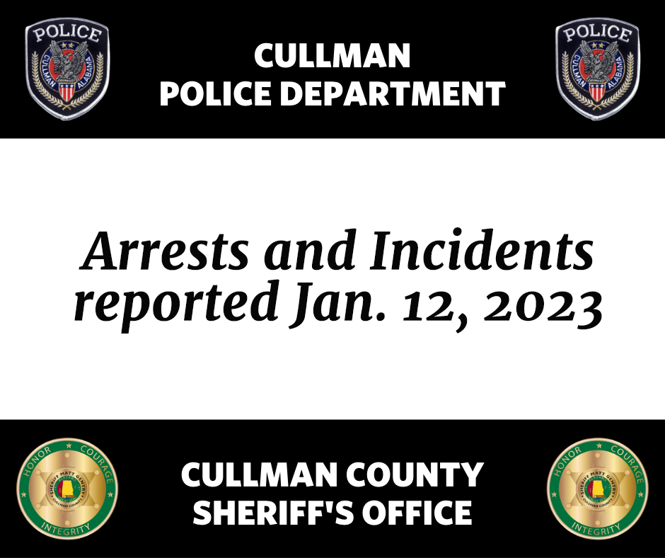 CULLMAN, Ala. – Below are the arrests and incidents reported Jan. 12, 2023. All persons are innocent until proven guilty.