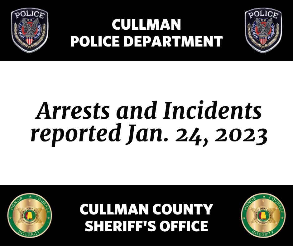 CULLMAN, Ala. – Below are the arrests and incidents reported Jan. 24, 2023. All persons are innocent until proven guilty.