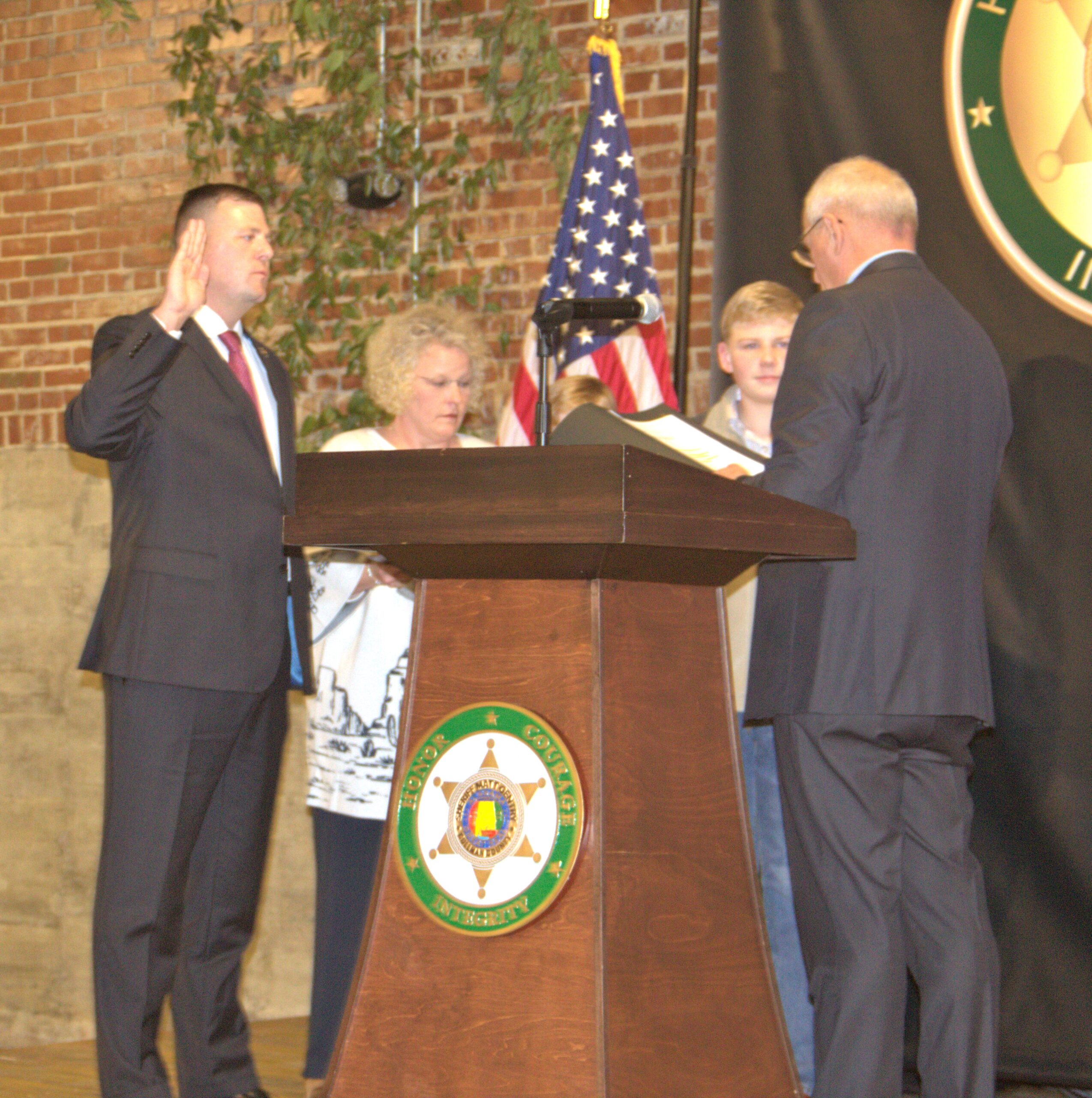 CULLMAN, Ala. – Matt Gentry was sworn into his third term as Cullman County sheriff Saturday, Jan. 21, at Cotton Creek Warehouse in downtown Cullman. With his wife, Susie, and sons, William and Walker, next to him, Gentry was administered the oath of office by his father, Roger Gentry, in front of a large audience.