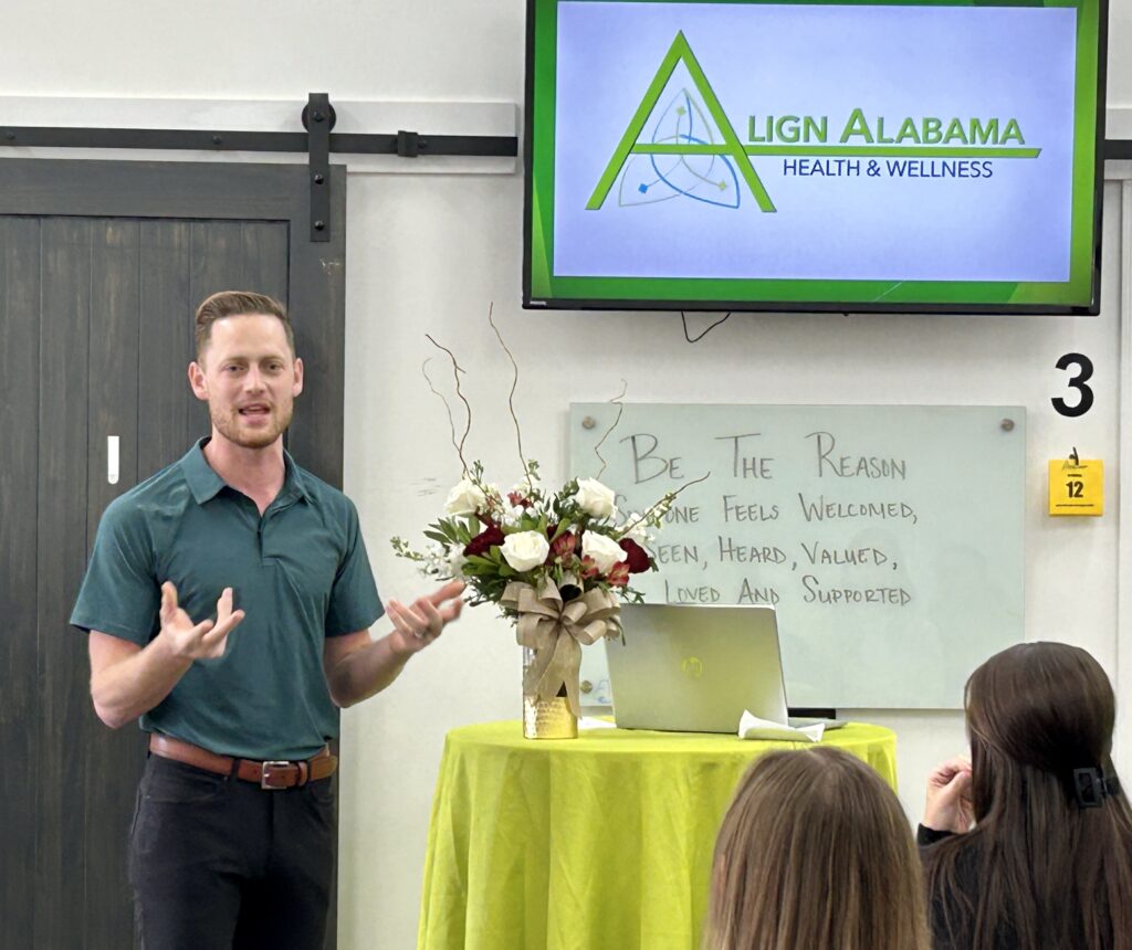 A visit to Align Alabama Health and Wellness gave the leadership class insight into the holistic approach to whole body wellness offered by Dr. Nathan Lewis and his fellow chiropractors and staff. Explaining an approach that addresses five core components of wellness, Lewis said Align Alabama targets not only chiropractic care, but also emphasizes the inclusion of nutrition, exercise, mindset and detoxification to establish and maintain homeostasis, or balance in body and life.