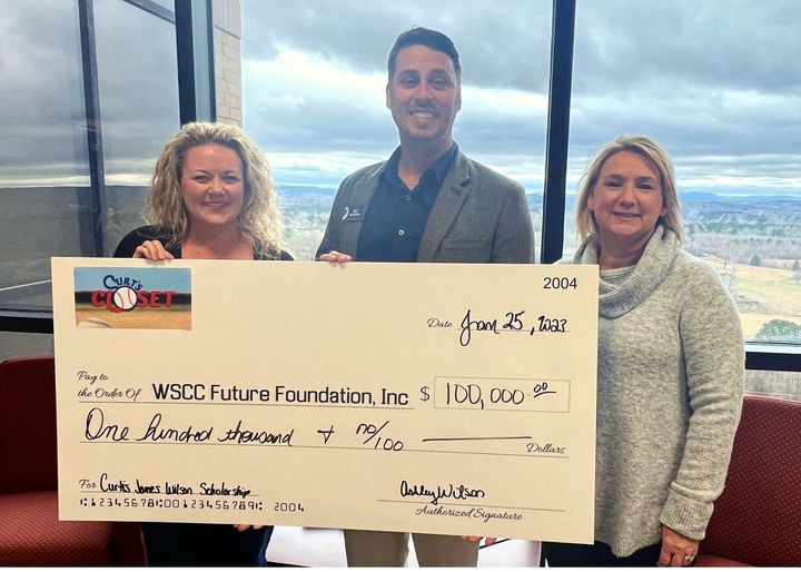 HANCEVILLE, Ala. – The Wallace State Future Foundation recently received a $100,000 check from Curt’s Closet Executive Director Ashley Lee Wilson to help fund the Curtis James Wilson Memorial Legacy Endowed Scholarship. Curt’s Closet has also announced that it has a very generous donor who has agreed to match all donations from the link below up to $100,000!