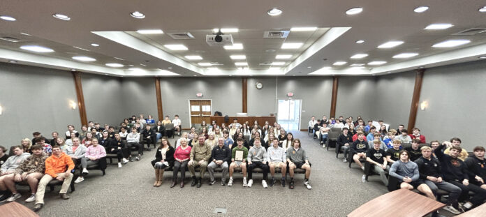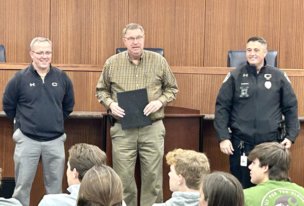 CULLMAN, Ala. – Approximately 100 Cullman High School student athletes joined Cullman City Schools Athletic Director Mark Stephens, Victim Services of Cullman Counselor Lauren Orth, Victim Services of Cullman Child and Family Program Coordinator Stephanie Driver and Cullman Mayor Woody Jacobs on Monday, Feb. 6, at Cullman City Hall, where Jacobs signed a proclamation declaring February as Teen Dating Violence Awareness Month in the city.