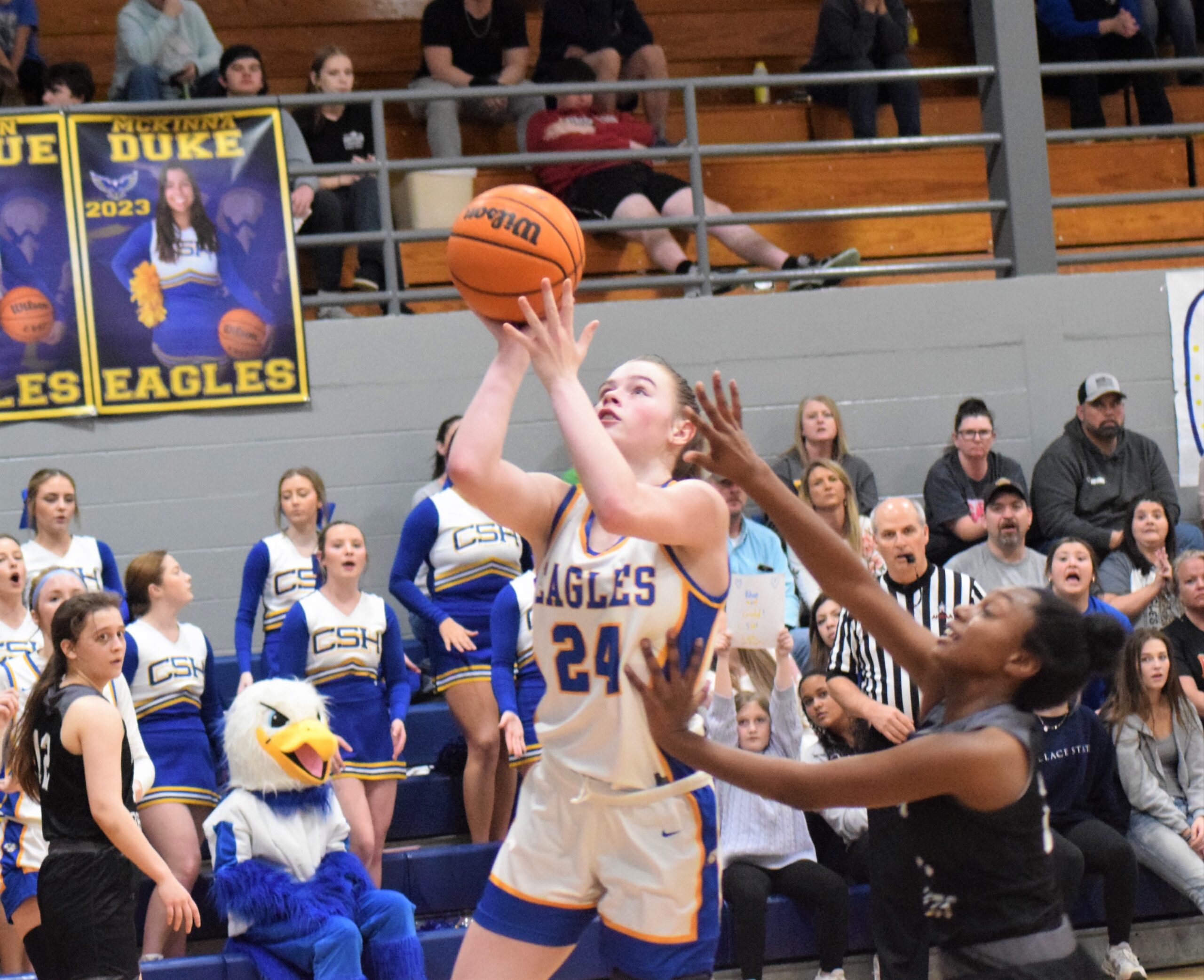 Brown put in a driving layup to start the second half for Cold Springs to make it a 22-19 game, but the Lady Hornets tied the game up at 22 on a basket of their own. Bruer drilled her third trey of the game to break the tie and give the Lady Eagles a 25-22 lead with a little over five minutes to go in the third. The Lady Hornets hit one of their own from deep as that gave them their first lead of the game at 27-25, but a trey by Dickerson with a little over two minutes gave Cold Springs the lead right back at 28-27. Baskets in the paint by Malaya Taylor and Dickerson made it a 32-29 game going into the final period.