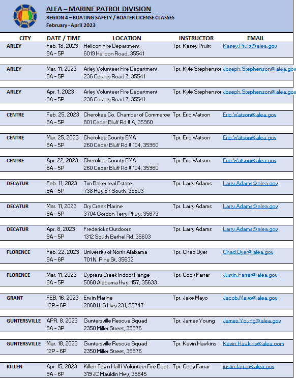 Prospective boaters are encouraged to email the following Marine Patrol Troopers for the session they would like to attend and to confirm times and dates. Find contact information at https://tinyurl.com/ALEABoating.