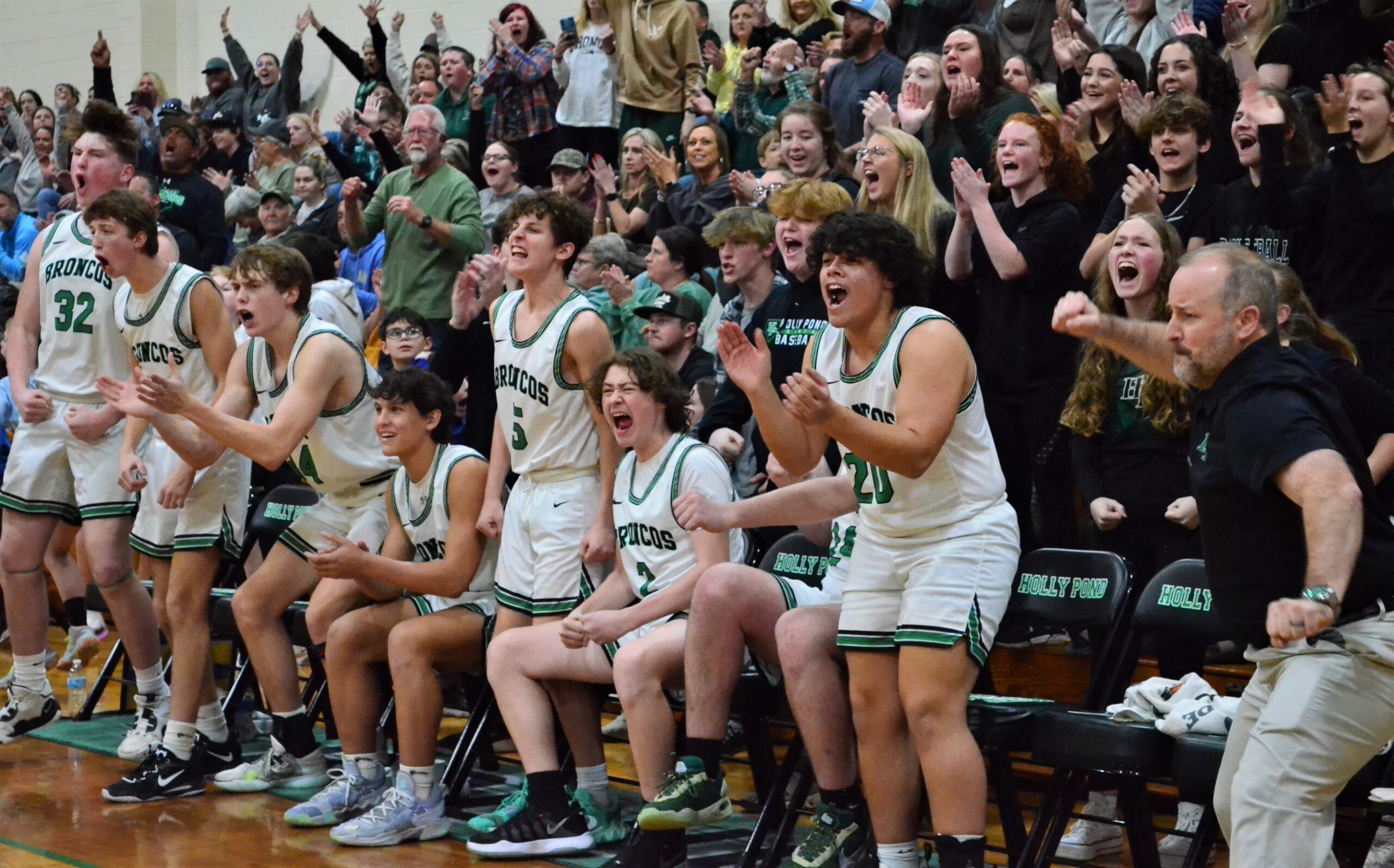 Holly Pond continued to ride its momentum at the start of the fourth quarter, starting with a three from Sawyer Olinger that made it a 2-point game. Brown hit two more free throws to tie the game at 39 and a basket by Rickard kept the score knotted at 41 later in the period. Olinger knocked down another three-pointer to give the Broncos a 44-43 lead with three minutes to play. Brown laid one in to keep Holly Pond in front 46-45 and after Olinger sank a pair of free throws to extend the lead to three with 1:30 on the clock, the Broncos were in control. Brown drove to the basket and scored to add to the lead and he drained two more free throws with 25 seconds remaining to give Holly Pond a 52-47 advantage. Rickard was fouled in the final seconds of the game, and he tacked on two more free throws to secure a 54-49 win and an area championship for the Broncos.