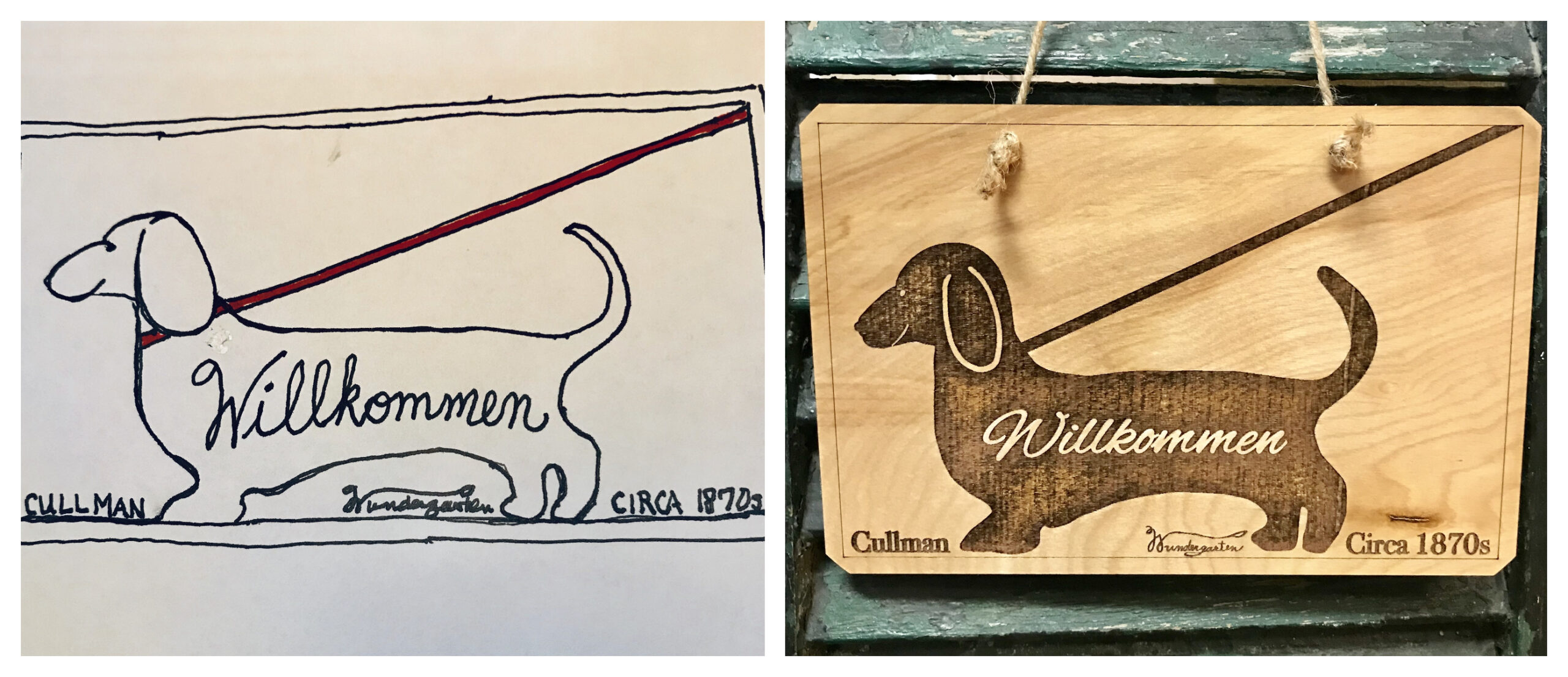 After Rob’s talk, I drew a rough sketch of the smiling dachshund as I imagined it since my childhood, then shared it with Cullman wood crafter, Leldon Maxcy. In turn, Leldon crafted the charming, vintage-looking sign. That’s the origin story of The Smiling Dachshund that would welcome, or willkommen, all to the wundergarten.
