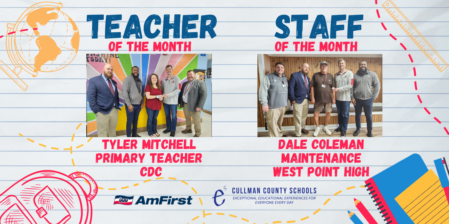 CULLMAN, Ala. – The Cullman County Board of Education (CCBOE) and America’s First Federal Credit Union (AmFirst) recognize a teacher and staff member each month.