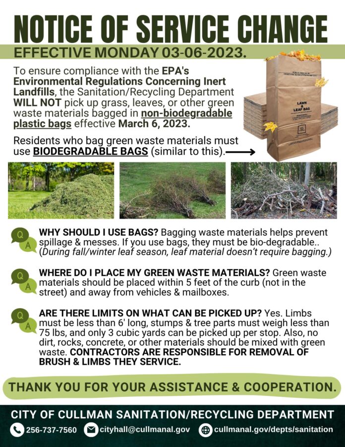 CULLMAN, Ala. – To ensure compliance with the EPA’s environmental regulations concerning inert landfills, beginning this week the Sanitation/Recycling Department will not pick up grass, leaves or other green waste materials bagged in non-biodegradable plastic bags. Residents who bag their waste materials (grass, leaves, etc.) must use biodegradable bags.