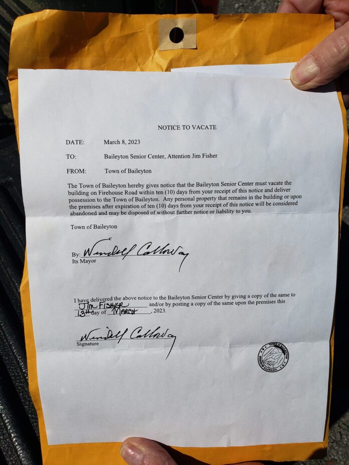 BAILEYTON, Ala. – Senior citizens in Baileyton who meet weekly at the Baileyton Senior Center say the future of the center is in jeopardy after they received a notice last Thursday to vacate the premises within 10 days. The notice, picked up by James Fisher, president of the center, on March 16, was dated March 8 and signed March 13 by Baileyton Mayor Windell Calloway.