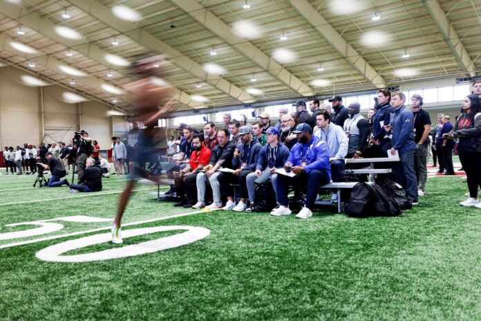 TUSCALOOSA, Ala. – The University of Alabama football program hosted its annual Pro Day inside the Hank Crisp Indoor Facility Thursday, with 15 draft-eligible Crimson Tide athletes showcasing their talents and meeting with representatives from all 32 NFL teams.