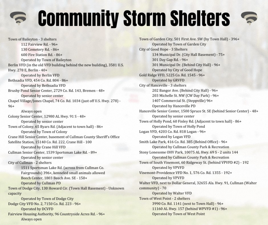 CULLMAN, Ala. – The Cullman County Emergency Management Agency (EMA) has provided a list of available storm shelters for inclement weather. If you are not in a substantial structure, please go to a shelter. For the safety of shelter occupants, especially small children, please do not take pets to shelters unless one specifically notes that it is pet friendly.