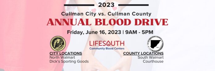 CULLMAN, Ala. – The annual Cullman City vs. Cullman County Blood Drive is this Friday, June 16,from 9 a.m.-5 p.m.