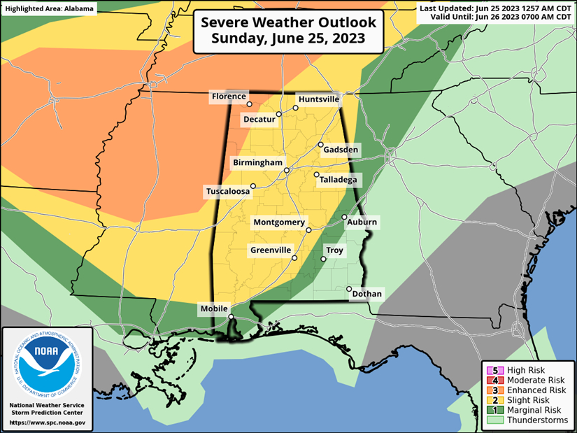 The second wave will enter northern Alabama between 5 pm and 8 pm, combine with the first wave of storms and continue southward across the state into Monday morning.