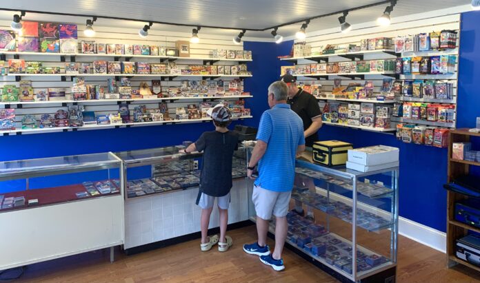 “I collected cards like a lot of people back in the ‘90s. There was a big boom in the market, and they also just printed stuff to the moon. A lot of that stuff isn’t worth as much now unfortunately but like a lot of people I kind of got out of it when I got out of college and had to pay my own way. That was expendable income that I didn’t want to expend,” Kampis joked. “So, I got out of it for about 20 years and what got me back into it was I bought a collection from Moulton on Facebook Marketplace, and it was a guy’s stuff from a card store over there in the late ‘80s and early ‘90s. I really bought it just to kind of liquidate it but once I started sorting through them it really rekindled my love of cards and then I realized that the market had gone nuts. In 2020 when Covid first hit all the collectibles markets went up because people were stuck at home and getting back into their old hobbies. So, that was really the emphasis behind it and things just kind of moved quickly from there until we opened the store in April 2021.”