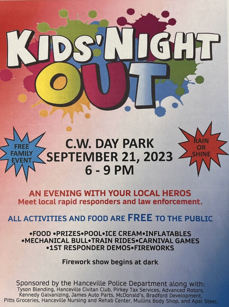 HANCEVILLE, Ala. – The Hanceville Police Department (HPD) is set to host Kids’ Night Out, an outreach event designed to familiarize the youngest members of our community with law enforcement and other local heroes on Thursday, Sept. 21, 2023, from 6-9 p.m. at C.W. Day Park in Hanceville. The event is free to the public and held rain or shine.
