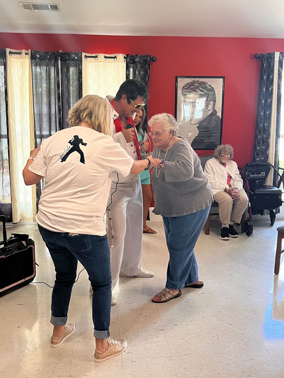 The party kicked off with each resident receiving an award before indulging in peanut butter and banana sandwiches and other Memphis fare. The delight of the afternoon, though, was a visit from a surprise guest, The King himself (Elvis impersonator John Ellis). Ellis strolled into the room on a red carpet while the ladies couldn’t help but elbow each other and grin. As Ellis sang along to Elvis classics, residents clapped and shimmied along with him. Resident Eunice Camp, 95 years young, stood up and started twisting and twirling to the rockabilly beat with Briscoe.