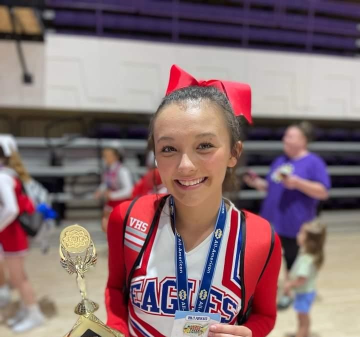 VINEMONT, Ala. — Vinemont sophomore cheerleader Krimson Gingrich is cheering on the Eagles varsity squad for the first time this year and has had an amazing experience so far.