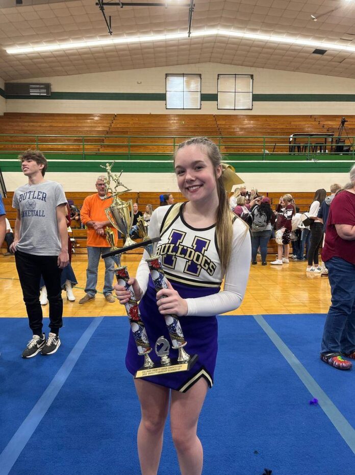 “It’s been so great. Abby Sharp and Josie Radcliff have definitely been some great mentors for me. Abby was my first friend on the cheer team when I made the squad. Each and every one of the girls are willing to work super hard for our goals. We would love to win the county competition this year and hopefully, compete well in other competitions too. When it comes to football and basketball season, we definitely keep our spirits up and lead the crowd and our teams towards big wins. The girls are always ready to help one another in any way they can. There’s been many times where the team will be frustrated with one another, and a girl will step up and give us a simple pep talk to help us get through it. The girls are very genuine and helpful to one another. We go by, ‘There is no ‘I’ in the word team’. We live through that quote. We are a team, so we strive for victories together. Our team is very special and one of a kind.”