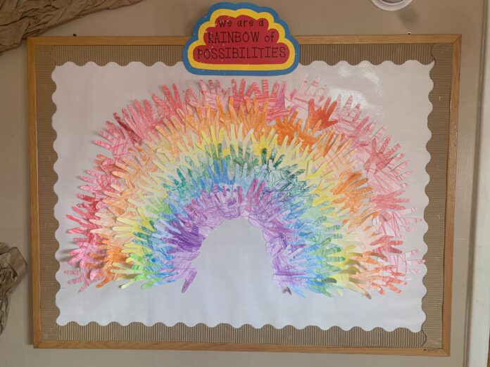 Handprint rainbows and artwork adorn the walls.  (Cheyenne Sharp)