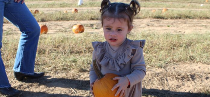 After much fussing and even taste tests, a dirty-faced River Jane Murphy-Burns chooses her pumpkin from The Great Pumpkin Patch located in Hayden, Alabama. (Cayla Grace Murphy)