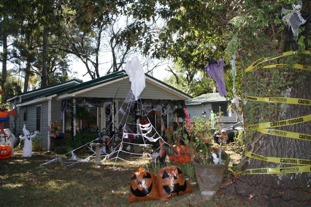 Caution tape marks the scene where jack-o-lanterns and goblins reside, waiting to spook passersby. This Halloween display contains oversized spiderwebs, and creepy inflatables varying from the grinning Cheshire cat to possessed trees waiting to devour a soul. With over 100 decorative pieces, there is something for all at this family friendly fright fest.