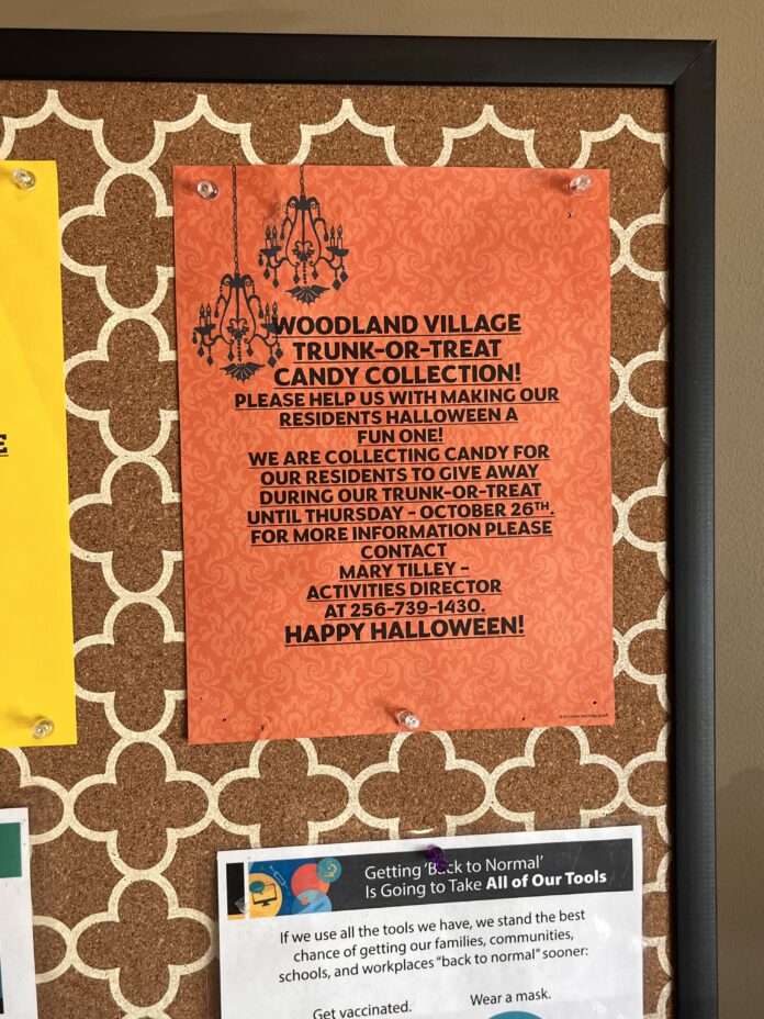 CULLMAN, Ala. –  Woodland Village Rehabilitation & Healthcare Center is preparing for its largest fall carnival yet after a four-year hiatus due to COVID-19. While the lawns are already covered in spooky inflatables, and the reception area boasts dangling conical witch hats and festive Halloween decor, Woodland Village needs just one more thing to make the return of the carnival successful: candy.