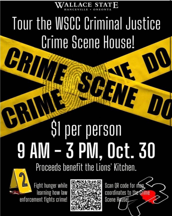 HANCEVILLE, Ala. – While haunted houses and frightening corn maze experiences are fairly common this time of year, few things spark more fear than the scene of a violent crime – well, a replica of one, anyway. Wallace State’s Criminal Justice academic division is offering a unique spin on gory attractions by hosting its very own “Crime Scene House” on Monday, Oct. 30, 2023, with proceeds benefiting Lions’ Kitchen, an active food and toiletry pantry on campus.
