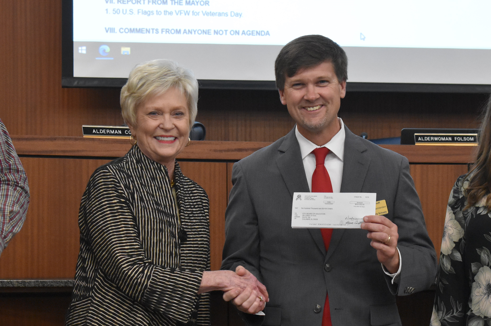 CULLMAN, Ala. – The Cullman City Council on Monday presented a $600,000 check to Cullman City Schools, part of a long-term plan to help fund multiple construction and capital improvement projects in the system.