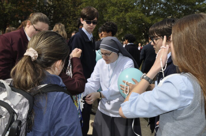 CULLMAN, Ala. – In a heartfelt demonstration of unity and faith, students at St. Bernard Preparatory School recently participated in a unique and inspiring event, the Living Balloon Rosary. Led by Sr. Therese Lopez, director of Campus Ministry, the school community gathered to form a giant rosary using vibrant, colorful balloons, symbolizing their shared devotion to prayer and reflection.