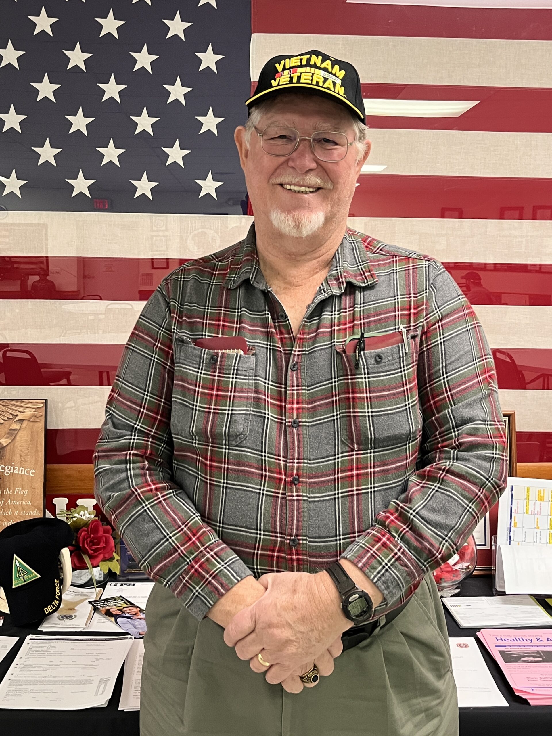 Clarence Benefield poses in front of a framed flag at VFW Post 2214 in Cullman. (Cayla Grace Murphy)