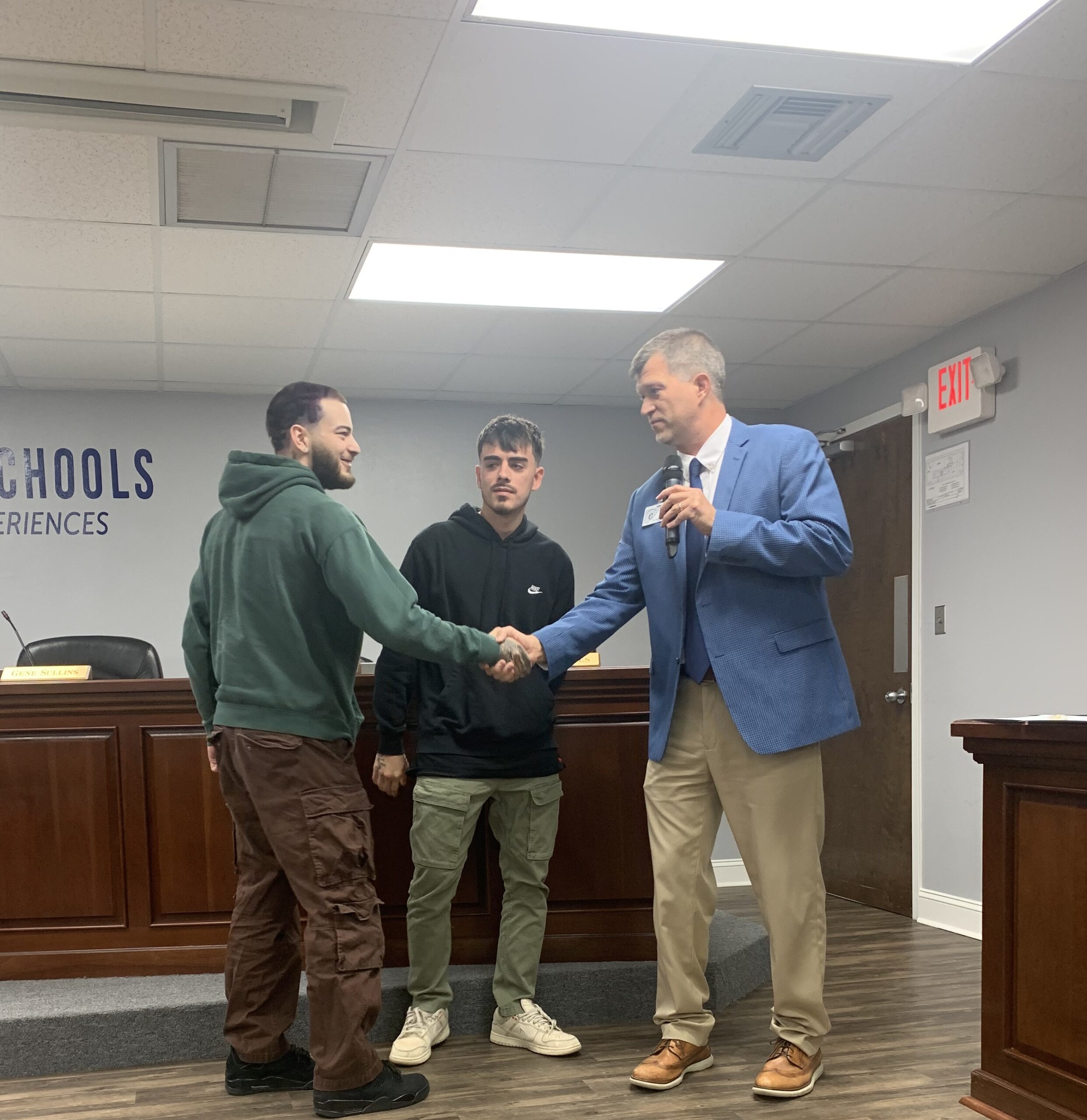 Superintendent Dr. Shane Barnette also recognized two former students. Barbers Isaac Ludwig and Dustin Moore have been travelling throughout Cullman County, visiting local schools and providing free haircuts to students and others. The duo also made a stop at the Cullman County Sheriff’s Office.