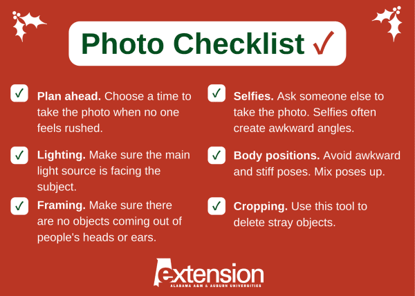 Photos are great to include on holiday cards. However, there are a few things to remember when choosing the photo. Margaret Barse, an Alabama Extension multimedia producer, said photos should be fun.
