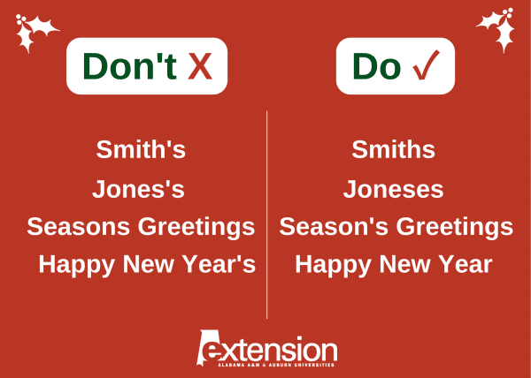 Holiday cards are often the bane of an English teacher’s existence. Why? Because they often include grammatical errors. Glenda Freeman, an Alabama Cooperative Extension System communications editor, said one of the most common mistakes in holiday cards is misusing the apostrophe.