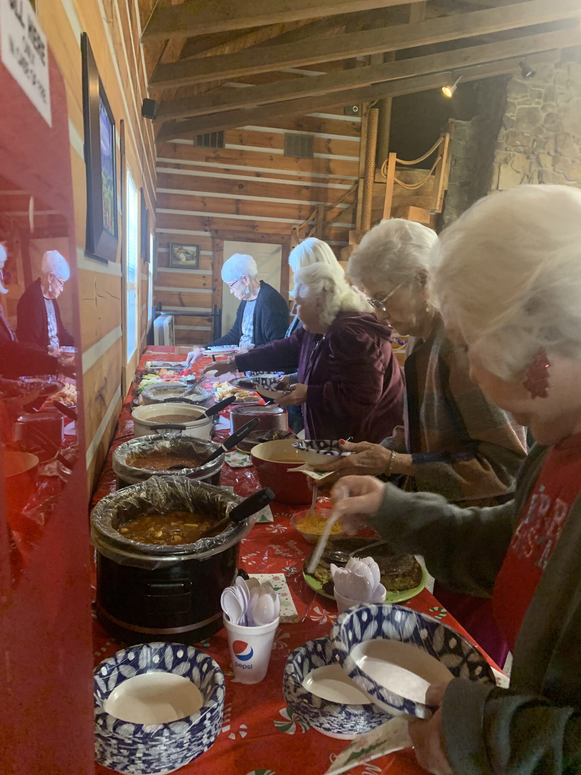During a lull in the festivities, 92-year-old Pete Haynes led the audience in a lively round of Christmas songs such as “Joy to the World” while waiting for the feast to be served; as soon as the songs were sung and the prayer was uttered, the seniors made their way to the spread of three types of soups, breads, toppings, sandwiches, vegetables and dips to pile their plates and mingle with friends, warming bodies and hearts with a single meal.