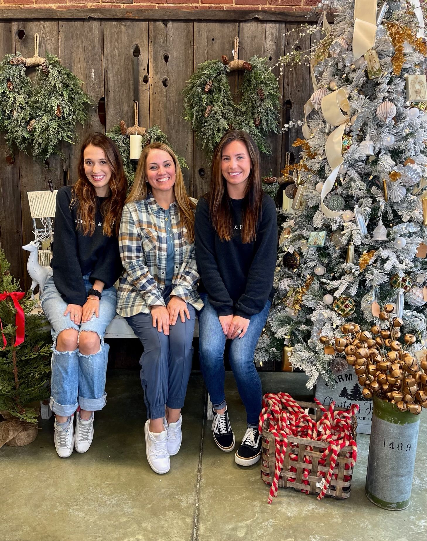 Left to right: Madi Claire Johnson, Heather Gudger and Cassie Riley smile among styled wreaths and a festive Christmas tree in Pierce & Petal’s studio. (contributed)