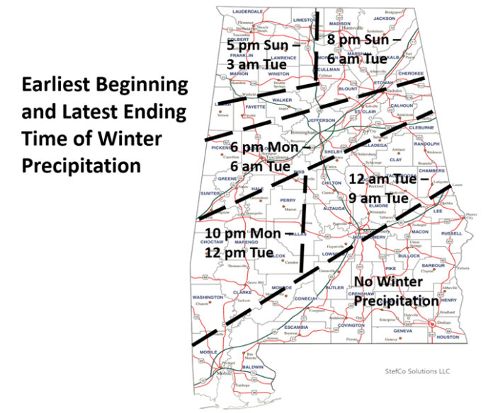 Precipitation will enter northwestern Alabama after 5 pm today, spread southward Monday into early Tuesday, and end by 12 pm Tuesday. In the northwestern sections, the precipitation will be all snow, possibly mixed with sleet to start. Southward to I-20, a mixture of snow and freezing rain is expected. South of I-20 and possibly as far south as Mobile – Montgomery – Lafayette (Chambers County) line, light rain turning into light freezing rain or drizzle is forecast.