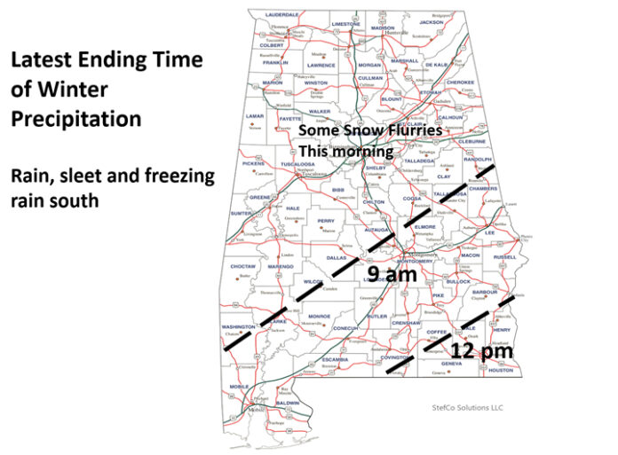 The good news is that at 6 am temperatures remain above freezing south of an Andalusia – Troy – Auburn line. Although precipitation will continue into mid to late morning, there should be only be 2-4 hours of light freezing rain in southeastern Alabama before the precipitation ends. There will be some snow flurries across portions of central and northern Alabama this morning, with no additional accumulations.