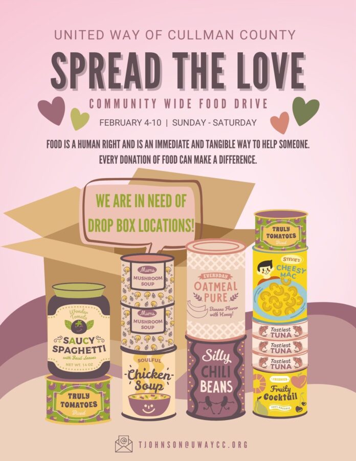 CULLMAN, Ala. – With dwindling stocks at local food banks, the United Way of Cullman County has stepped in for its second annual “Spread the Love” communitywide food drive, which will take place Sunday, Feb. 4-Saturday, Feb. 10. The United Way is hoping to beat its numbers from last year and collect over 5,000 pounds of canned and dry goods to help community members in need.