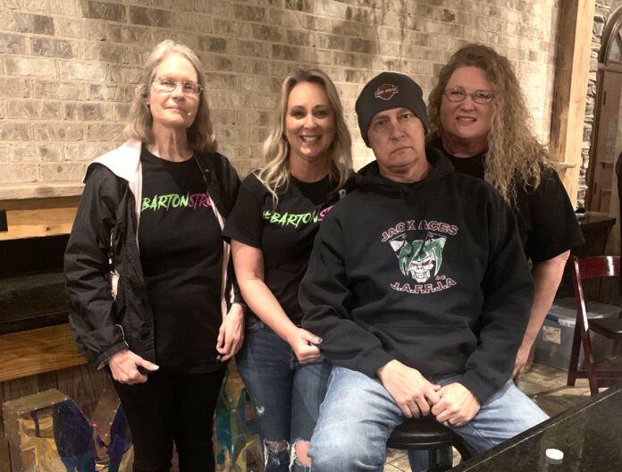 Derrick and Marcie Barton showed up to an outpouring of support from their biker family, as well as the whole community. Riding clubs Jack Aces and the Saints came together to hold a bike show to raise money to assist Derrick Barton with out-of-pocket costs after a recent cancer diagnosis. Pictured left to right are Derrick Barton’s mother Gail Harris, his wife Marcie Barton, Derrick Barton and his sister Michelle Patrum. (Cheyenne Sharp)
