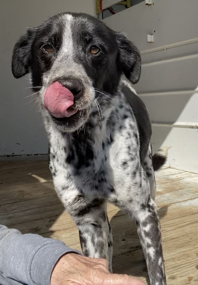 Eva is a beautiful, intricately spotted black and white female Aussie mix who is approximately 6 years old. She has long outgrown her puppy roughness but maintains a sense of graceful playfulness. Her mature age lends her a calm demeanor and she loves simply hanging out and being near her humans.